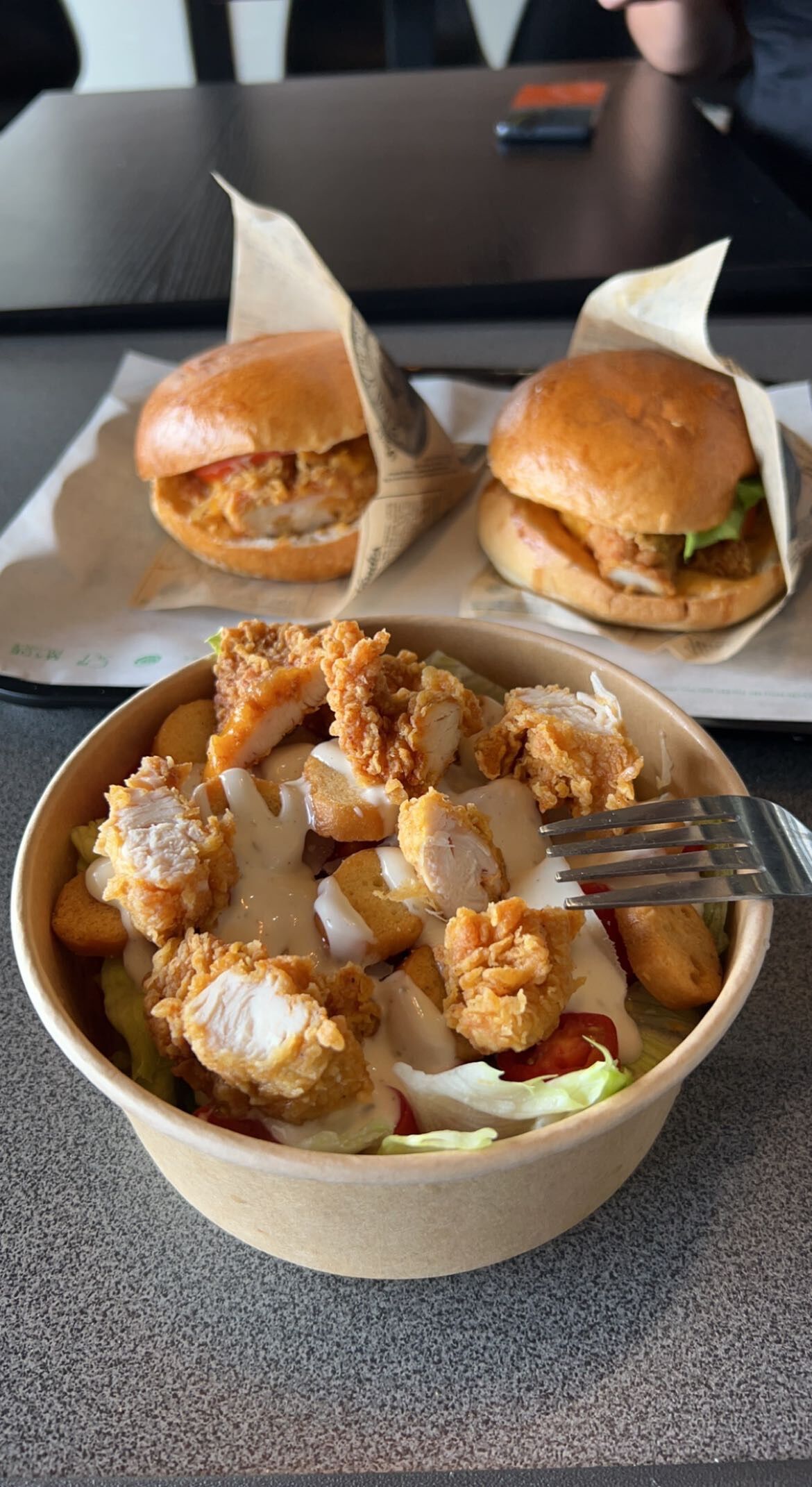 Nous cuisinons exclusivement des produits frais journaliers. Le pain burger et les tiramisus sont réalisés en boulangerie et le poulet frit dans nos cuisines, à la vue de tous.